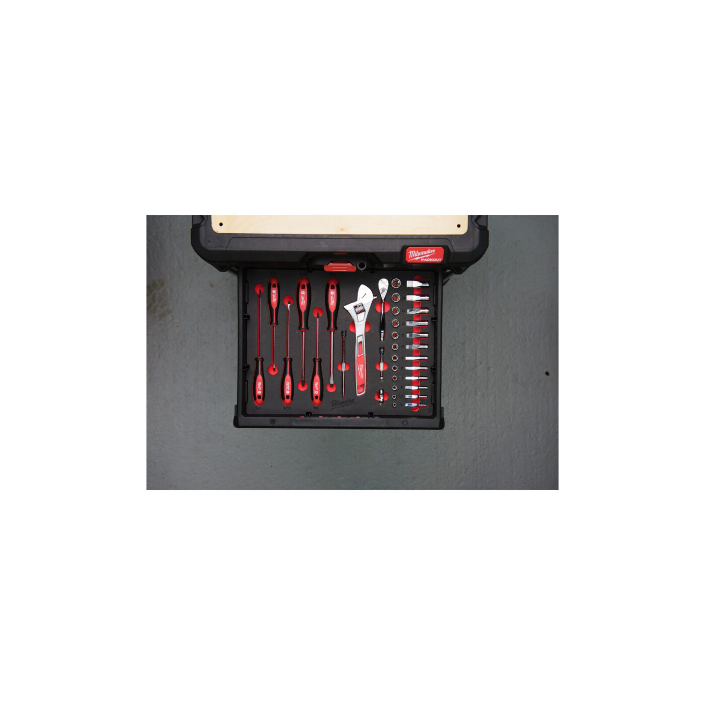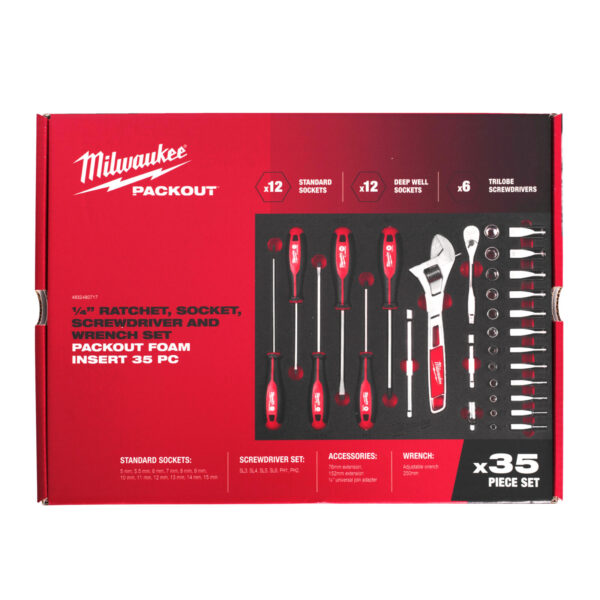 Pěnová vložka PACKOUT™ ¼″ s nástrčnými klíči a ráčnou 35ks - 1/4" Ratchet and Socket and Trilobe Screwdriver and Wrench Set Foam Insert