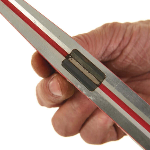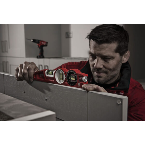- 360° nastavitelná libela s možnosti uzamčení. Identifikuje a opakuje nastavení jakéhokoliv úhlu potřebného na pracovišti. Libela se uzamkne kvůli zajištění přesnosti měření, klidně i po vyjmutí z kapsy.